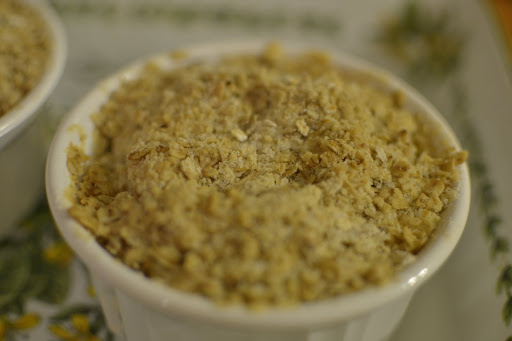 Crumbles in general are quick and easy to make. I work on 1 and a half pieces of fruit per person (if you’re doing apple, pear, peach, plum etc). If you’re using berries I would go with a cup per person, give or take. One of the main debates in crumble is the amount of crumble for the amount of fruit. I personally like a lot of crumble with my fruit and so am more likely to use more. I also make more crumble mix than I need and freeze the excess. This makes it even faster to get crumble-y goodness going the next time. Some people put spices into their crumble, either tossing it with the fruit or adding it to the crumble mix. I didn’t tonight but am partial to a little cinnamon once in a while. Depending on your fruit you may want to add a little sugar to the fruit itself, just a sprinkling mind because the crumble mix has sugar in it. I do this when the apples are particularly tart.