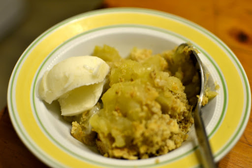 An apple crumble is like the epitome of comfort food in my book. Its warm, you can eat it with custard (as far as I’m concerned, custard constitutes its own food group) and it makes use of any excess tart apples you may have hanging around looking mournful in your kitchen. This afternoon it started to rain (again) just as I was in the kitchen sorting out dinner – lamb and tomato pasta. I decided that such weather was just screaming out for an apple crumble and I’ve been craving them all week so I took advantage of the opportunity.