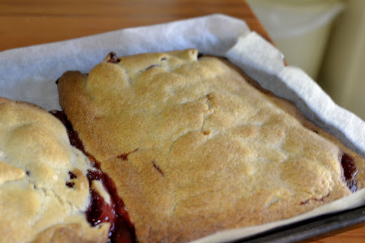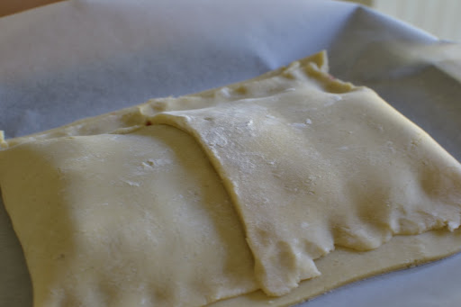 Now, the instructions say to roll out the pastry into a rectangle and then fill and bake this. I couldn’t get the dough to work nicely for me (see my rant above) so I eventually divided it into 2 pieces. I rolled each piece out, filled it with jam and then folded the edges to meet in the middle. As illustrated below.
