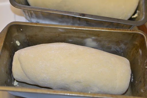 The next morning, take the dough out of the fridge. Grease 2 loaf tins. It will be very stiff and difficult to work with at first (though not as sticky as the day before) so I recommend using a rolling pin to roll out the dough. Divide the dough into 2 parts and form into loaves. Place these in the loaf tins and leave, uncovered, until the dough is risen to about 2cm above the tin.