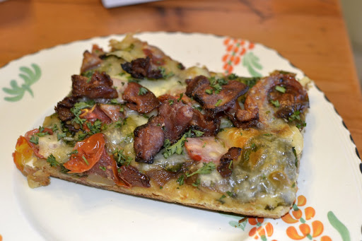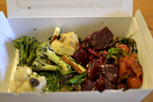 Today I was a little more fortunate. There was an aubergine salad with tomatoes that appeared new as well as a cauliflower one with caramelized onions. I ordered both as well as the broccoli salad with Halloumi and green beans and the beetroot with red onion. To go with the salads I thought I’d try one of their brioche pizzas, this one with crispy bacon, sun-dried tomato and more caramelized onion. (I usually order one of their pies, the pastry of which is excellent.) I hate to say it but lunch was incredibly unsatisfying. There was too much vinegar in the beetroot, the cauliflower was just on the raw side of al dente, the aubergine salad tasted of nothing. And why oh why were there sultanas with the caramelized onions? Sob.