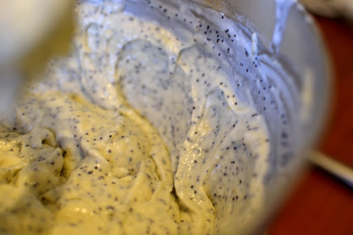In a standing mixer, cream the butter, sugar and zest until white and fluffy. Add in the eggs, beating well. Add in the flours, buttermilk and poppyseed mix in 2 goes, alternating each.