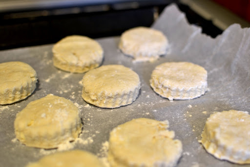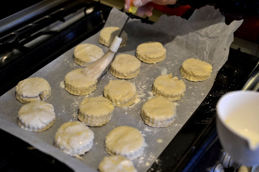 Preheat the oven to 220C. Place the dry ingredients in a bowl. Rub in the butter with your hands. Add in almost all the egg/milk mixture, reserving a small amount to paint the tops. (About a tablespoons worth). Mix until it starts to come together. At this point, if it looks a little dry, add in the double cream. Once you have a dough turn out onto a floured surface and pat down. Don’t roll it out. The mixture should be worked only minimally otherwise you’ll end up with stodgy, chewy scones not light, flaky ones. Use a scone cutter to cut out the scones and place them on a lined baking tray. Cut efficiently so that there’s only a small piece left which you can roll into a sort-of-scone-like-ball.
