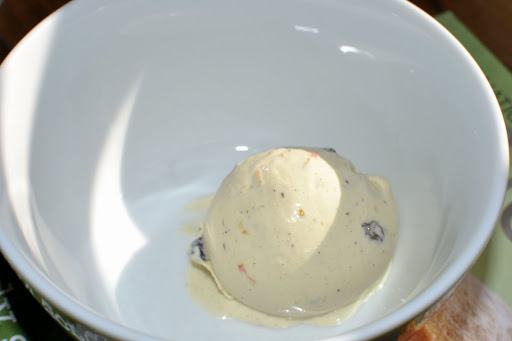 So the choice of Christmas ice cream is a little unusual for me. I’m not a fan of raisins, except when accompanied by salty peanuts, but this ice cream is such a winner I may have to rethink my stance on the subject. It has all the flavours of Christmas, plus the soaked raisins, that lift my mood the way only Christmas can. The recipe comes from a Delicious magazine, Christmas issue (2009) (I seem to have a few Christmas editions, Christmas being my favourite time of year and all) but I’ve adapted it in some ways. I cooked the raisins in the brandy and orange juice and zest for 10 minutes before allowing it to cool and sit overnight. I think this just gives the raisins an edge and moistness that would be lacking if you just soaked them. I also added the mixed spice to this mix to infuse before adding it to the ice cream. (The original recipe says to add the mixed spice to the almost perfectly churned custard.) Finally I added the raisins in at the beginning of the churning process. This is probably not the best idea if you ice cream machine is electric and violent but mine is ancient and requires me to turn it in the frozen cylinder so no harm done. I recommend just adding the raisin mix in at the end (as suggested in the magazine) to avoid any of the stress caused by early addition.