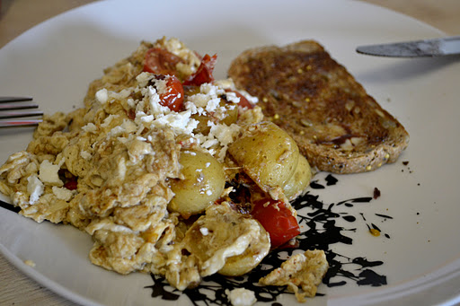This morning I made my first attempts at actual cooking in this new kitchen. For the last week I’ve been eating things that could be cooked in the oven (but required no actual preparation from me) and things that could be microwaved. I know. I feel like a traitor to the cause. But this morning I felt like eggs. And toast. And then I found some potatoes that I’d saved from a previous meal and some tomatoes that were languishing in the bottom of the fridge and it became obvious that scrambled eggs with these random fillings were in order. In the real world I’d have made a frittata but that requires an oven that can fit a large pan and my oven can barely fit a mouse (not that I’m cooking any of those). So this messy business is what I settled for. And it was surprisingly good too. Especially considering it took all of 3 minutes (once the plate had heated up – honestly, I don’t understand this cooking without gas thing. It’s beyond me.) It doesn’t really look like much that’s appetizing. If I’d been concentrating I would have taken the potatoes and tomatoes out whilst I did the eggs and then added them back in at the last minute along with some feta. I wasn’t concentrating so I ended up with a yummy mess. There are worse things I suppose.