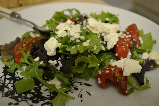 Whilst that was roasting I elegantly placed some leaves on a plate (elegantly being code for chucked generously) and added some sun-dried tomatoes and feta. (I would normally be a little purist about this salad and not add the tomatoes but I can’t seem to get enough of these at the moment and so am eating them on almost everything.) For the leaves I chose mostly rocket with some lettuce variations thrown in for good measure.