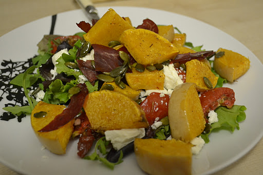 In a saute pan I then heated some pumpkin seeds (I say heated because as I am working from a hob and not gas things took a long while to get going) and added in some bresaola that was skulking in the back of the fridge looking grumpy. Once the pan had heated I added a little olive oil and fried it all together. Once the butternut was done I dumped it and the bresaola/seed mix onto the leaves. Et voila. Instant dinner happiness.