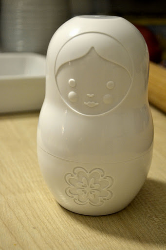 I finally (finally!) went out and bought a mixing bowl yesterday. And some measuring spoons. And the most awesome measuring cups I’ve seen in ages. Look! They’re matryoshka dolls! How cool?