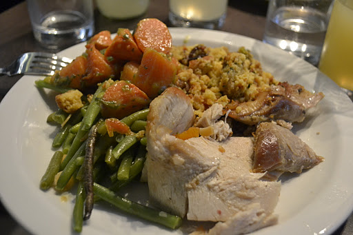 We visited the Friday after Thanksgiving so the lunch menu was filled with Thanksgiving staples – turkey, stuffing, brussel sprouts, beans, carrots, pumpkin pie. I had the turkey, sausage stuffing, beans and carrots and the Princess had a salmon sandwich on baguette.