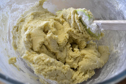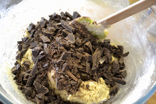 Beat the egg and yolk together with some vanilla before adding to the butter mixture. Add in half the quantity of flour and mix before adding in the milk. Add in the rest of the flour as well as the bicarb and mix to form a dough. If doing this by hand at this stage it is in fact easier to use your hands. Finally chop the chocolate into pieces and add it to the dough.