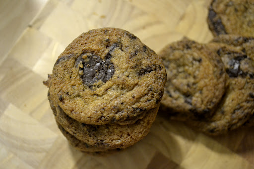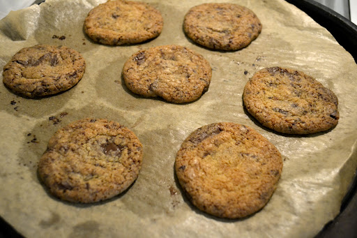 I digress. I changed up the sugars in this recipe. I only had 60g of soft brown sugar to hand so I used that and more caster sugar than the original recipe calls for. I also only used 225g of dark chocolate, again because that is what was in the cupboard. Also, don’t skimp on the chocolate quality here. Chocolate is the predominant taste in these biscuits and it needs to be good quality – between 62% and 70%. Just don’t use 85% because that is for savoury cooking and will make your biscuits unbelievably bitter. The recipe suggests scooping the dough out with an ice-cream scoop but my ice-cream scoop is clearly more substantial and makes giant biscuits. I used two teaspoons and because of the way the dough melts down in the oven, this worked fine. Just make sure to leave enough space between dough lumps because these biscuits spread in a rather violent way. I did 8 to a round tray after my first attempt with 10 led to me pulling apart weird square biscuit shapes. This made loads of biscuits, about 30 at least.
