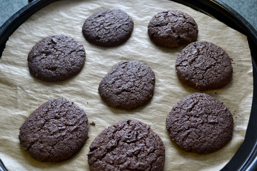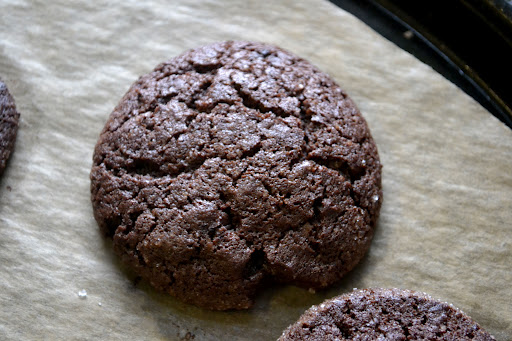 So I rolled the dough into 4 little logs, dolloping it onto the clingfilm with my spatula, not getting the hands involved at all. The dough had the consistency of an extremely thick cake batter and was very sticky. There wasn’t much to do except roll them carefully into logs and leave them in the fridge. (Upon re-consulting the blog I discovered that they were originally made as drop cookies which makes sense when you first see the batter.) The next morning I had slice-able logs. A miracle! I rolled the logs in granulated sugar and sliced them into rounds. I even sprinkled them with a little salt. Baking took about 10 minutes and then the cookies had to cool on a tray. The result was an intensely chocolatey, soft-in-the-centre cookie that was the perfect mid-afternoon slump fix. The salt sharpens the taste of the chocolate. You can find the recipe here. I made them as per Molly’s recipe and didn’t do anything different. I even beat the butter to white with my newly bought hand mixer. (I was rather excited about it at the time!)