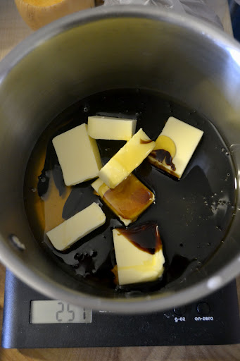 Place the butter, golden syrup, black treacle, honey, sugar and vanilla in a saucepan and heat until the butter melts.