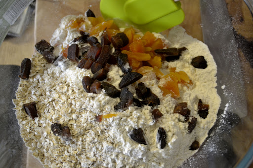 Put the oats, baking powder, flour and apricots into a bowl and mix so that the apricots are coated in flour.