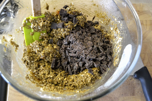 Finally add in the chopped chocolate. Because the mixture is warm the chocolate will melt slightly so don’t be alarmed when this happens. You’ll still have larger pieces of chocolate that will survive the heat. Press the mixture into the baking tray using the back of a spoon or the back of your hand. Squish it right into the corners.