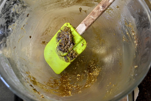 Add the liquid to the dry ingredients and mix until combined. Make sure you scrape the bottom of the bowl because the flour has a nasty habit of hiding out down there and reappearing as you’re trying to squish everything into the baking tray.