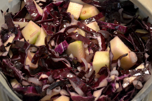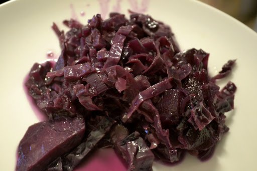 Slice the shallots finely and, in a heavy bottomed pan, fry until translucent in a combination of butter, oil and salt. Chiffonnade the cabbage and add to the shallot, stirring to combine. Peel and chop the apple into square-ish pieces. Pour the wine into the cabbage followed by the sugar and spices. I didn’t measure any of these but sprinkled and grated until I was sure there was enough. You can always add more towards the end of the process. Finally add in the apple. Give everything a good stir, then turn down the heat and cover. Cook for two hours, stirring on occasion and making sure the pan doesn’t run dry. Add some water if you’re worried. Eat with pork.