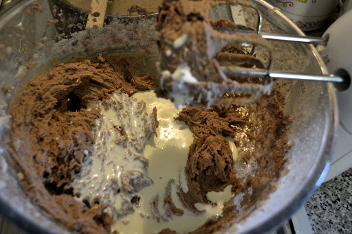 Weigh out the dry ingredients, give them a stir and then add them to the mixture followed by the sour cream and finally, the chocolate. Make sure everything is well mixed.