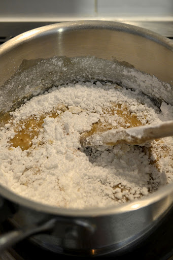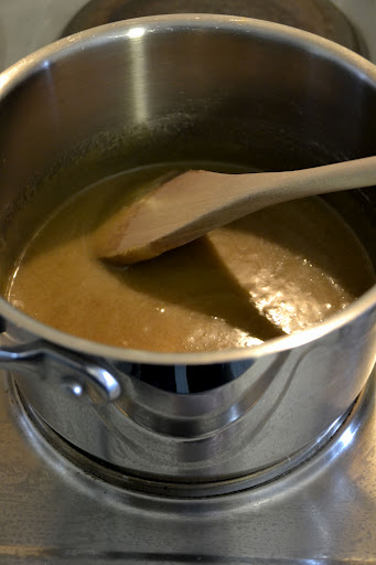 Bring to the boil and boil for about one minute. The caramel should be reasonably dark. Whilst the caramel is still hot, add in half the icing sugar.
