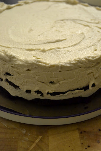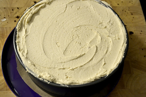 Once your cake has been resting in the fridge for a half hour you can ice the final layer. To serve, unlatch the ring and slide it off the cake.