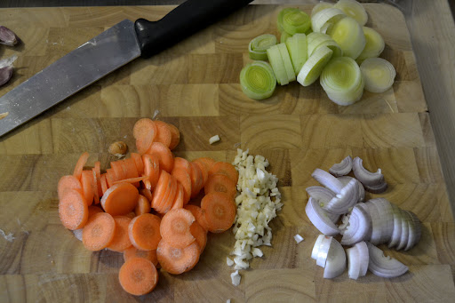 Slice the shallots, leek and carrots into similar sized rounds. Crush and finely chop the garlic. Remove the skin from the chicken thighs and slice into similar sized pieces, keeping the bones.