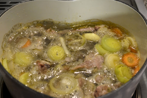 Fry the shallot until slightly translucent before adding the leek and carrots. Allow everything to soften slightly before adding the garlic. Finally add back the chicken pieces and bones. Add enough cold water to cover everything and bring to a simmer. Simmer for 45 minutes, skimming the surface to remove any impurities every now and then. Season with salt and pepper.