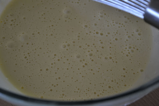 Whisk the eggs and sugar until white and at ribbon stage. (They should double in volume.)