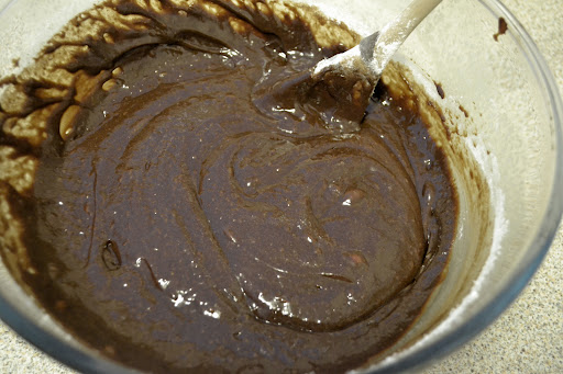 Melt the butter on the stove, remove from the heat and add in the chocolate, broken into pieces. Allow everything to sit for a minute before stirring until smooth.