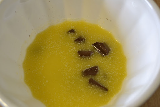 Melt the butter in a saucepan and pour it over the chocolate. Allow to sit for a minute or two and then stir until smooth and combined.