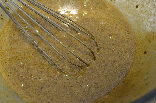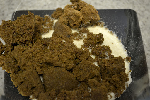 Stir the two sugars together – the muscovado has a tendency to clump so be sure it’s smooth before you add the eggs. Whisk everything smooth.