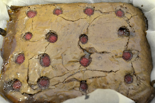 Pour this into the lined baking tin. Dollop the caramel onto the mixture and using a blunt knife, swirl it through. Lastly place the raspberries over the mixture.