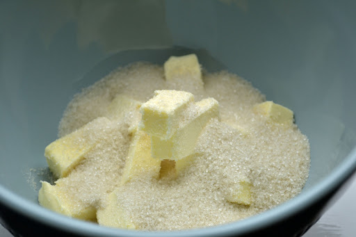 Cream together the butter and sugar until bright white and fluffy. This takes about five minutes but helps with the aeration of the cake.