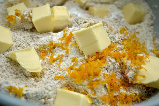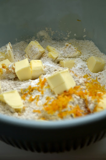 In a bowl weigh out the dry ingredients. Add the cold butter to this (I cut it into small cubes) and rub the butter into the flour until the mixture is flaky and resembles breadcrumbs.
