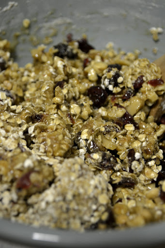 I made mine with cranberries and sour cherries and walnuts (and used a full 3 cups worth because I wanted them packed with goodness) but you can use pretty much any combination of fruit and nuts you like. I also added maple syrup (because I have some in the cupboard and if I’m not careful it’ll still be there when I’m all handed in, gasp, and packing up, in 22 months time! Yes, I have started a count down.) but you could use golden syrup instead. I couldn’t be bothered to blend oats into flour (all that setting up of gadgetry was just too much to ask) so I made mine with wholemeal flour. This is the kind of recipe that can be adjusted to using up random ingredients in the cupboard. I’m not going to write out the version I used because it’s basically the same as the original, which you can find here. I did use the less amount of sugar though and they still came out super sweet.