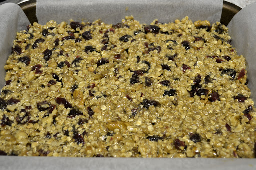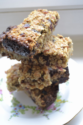 But I digress. I first saw these bars on Smitten Kitchen and no, I’m not totally obsessed with that site, (okay, well maybe just a little) but she seems to always make things I want to make – like the scones or the buttermilk triple berry cake or oreos or these custards which are still on my list of things to do. Anyway, these bars seemed like the perfect breakfast on the run/in the train/eaten surreptitiously at the back of a classroom kind of food. They’re dense and chewy (for British readers, these are not flapjacks – they’re way more cooked than flapjacks and for South African readers, these are kind of like a crunchie – although I’m not sure of the rules regarding fruit and nuts in crunchies, my grandmother always made hers plain), filled with fruit and walnuts and syrup. They pack a punch of sugar, enough to get you out of bed and paying attention pretty quick. I think the oats stabilises the sugar though so you don’t collapse at 10am again. In short, good breakfast substitute. They’re also good in the afternoon, if you need to get over that dead time at 4pm.