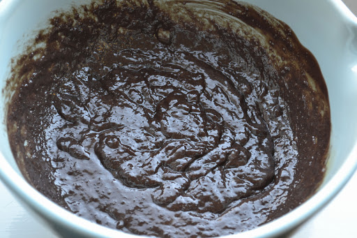 Melt the butter and chocolates together – you can do this in a microwave (I did) or over a double boiler. Whichever you choose, make sure the mixture doesn’t get too hot. To do this successfully in the microwave, buzz the mixture for 30 seconds at a time, stirring and giving it time to cool in between. Whisk the sugars into this mixture, followed by the eggs. Try not to over combine things. Stop mixing when it’s all come together.