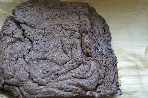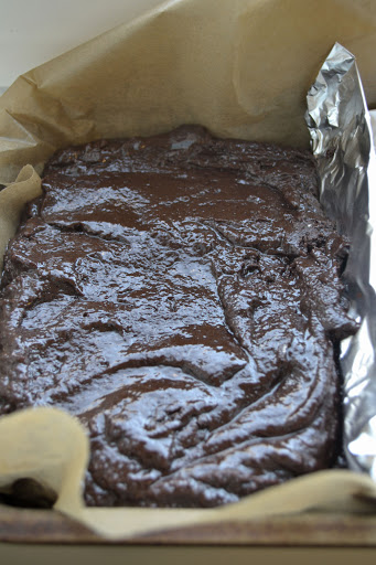 Preheat the oven to 180C and line a square baking tin with parchment paper. I halved my usual tin using a foil barrier which worked fairly well.