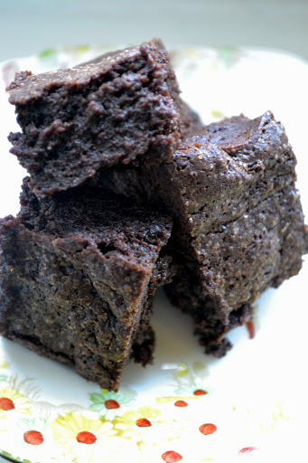 These brownies are adapted from Baked Elements, which I’ve mentioned here and here. I had a sudden craving for very dark chocolate brownies and these are made with chilli powder which adds a kick of spice that gets you at the back of your throat right at the end. They’re dark, dense and totally addictive. I made only half the recipe as I wasn’t sure about the chilli. I also changed the sugars to suit what I had in the cupboard. I ended up putting the brownies into the fridge to firm up slightly and the result is a squidgy, soft texture. They’d be rather good, I think, as a dessert at the end of a dinner party, possibly served with just vanilla ice-cream.