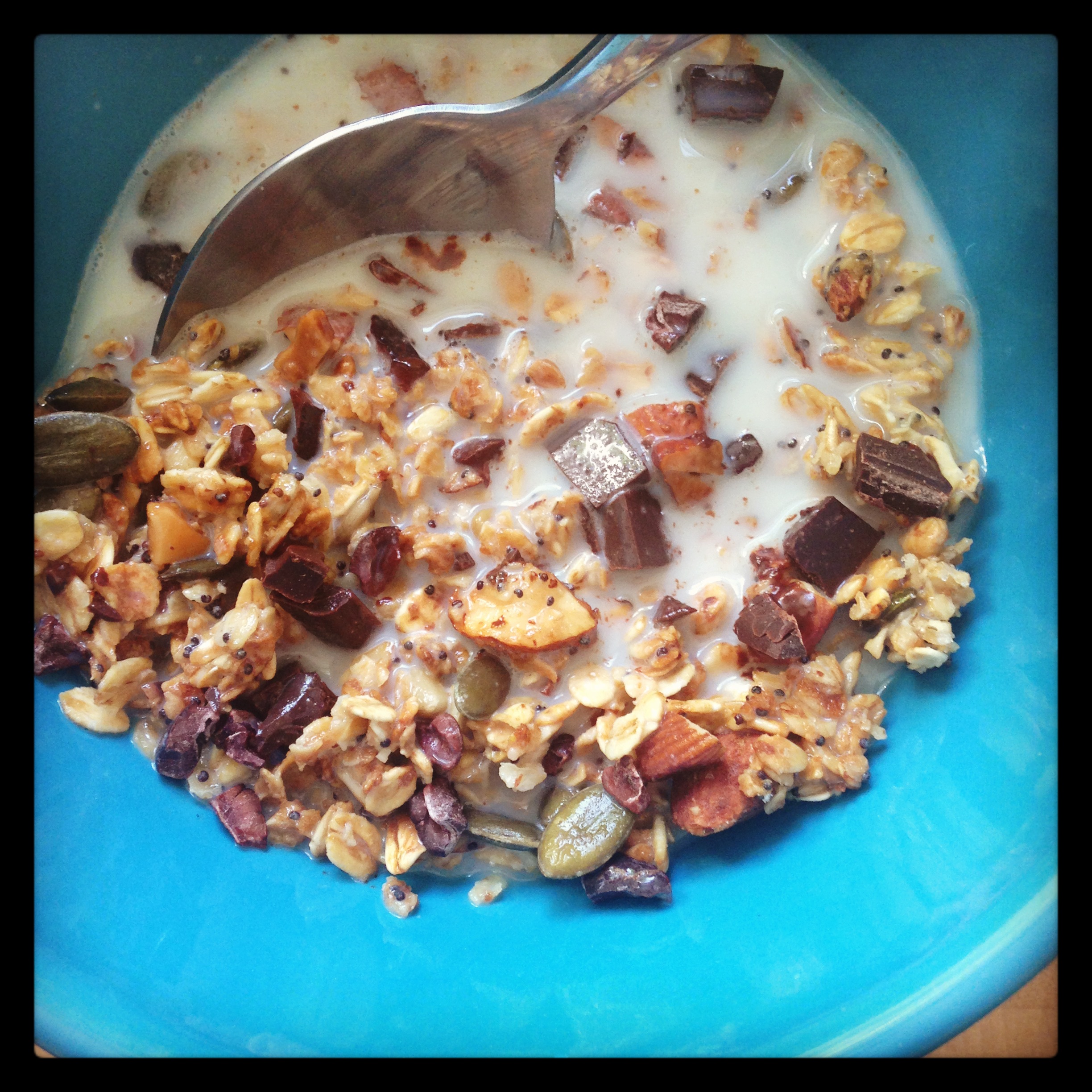Once cool, stir in the chocolate and cacao nibs. Eat! (With milk…) And store in an airtight container.