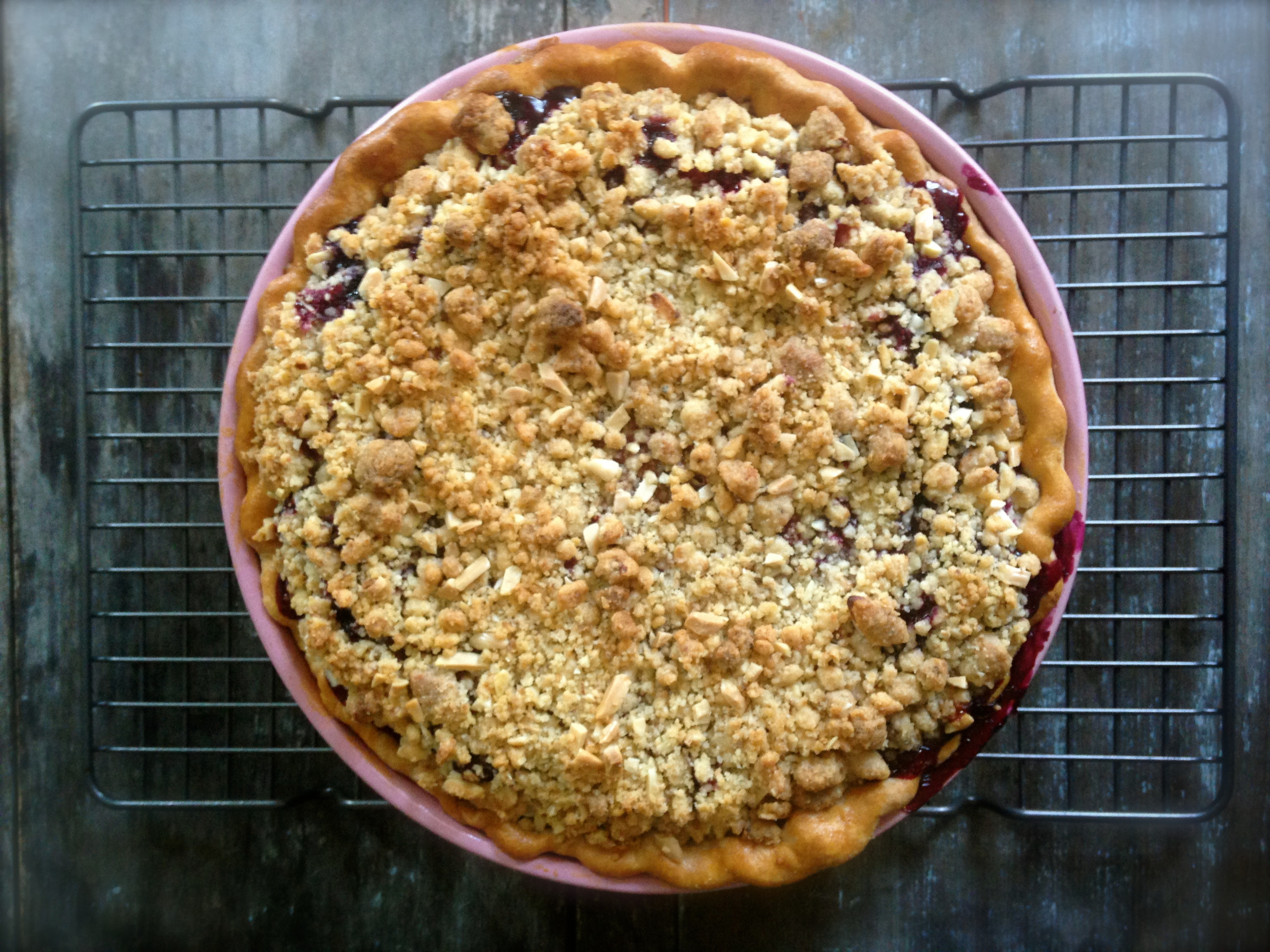 This particular blueberry pie has an almond crumble top and no recipe. But I will tell you what Molly told me verbally. (This presupposes you already have some pie dough in the fridge. If you don’t, follow the instructions for the cherry pie recipe.)