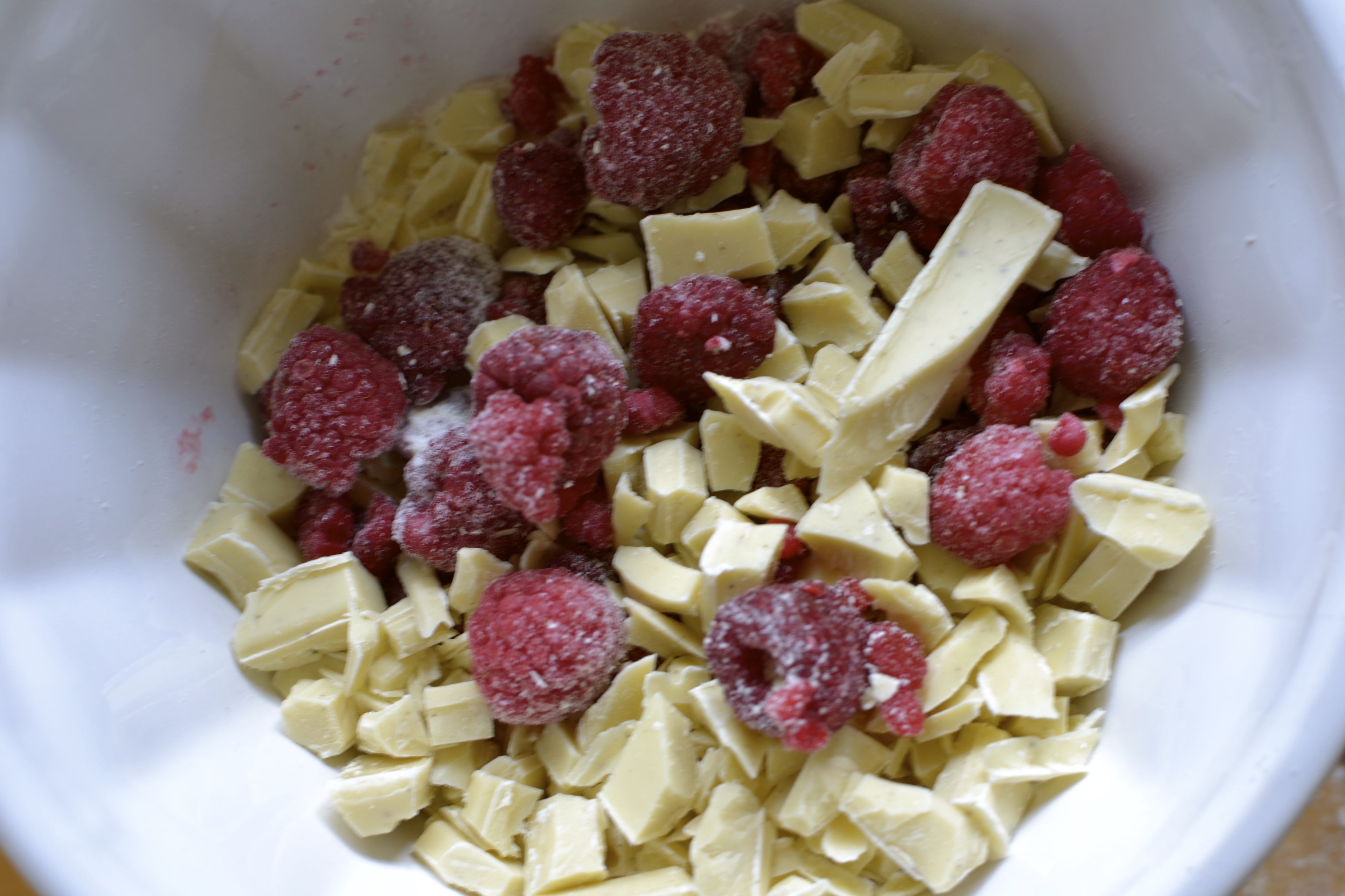 Whisk the eggs into the syrup then fold in half the flour mixture. Put the white chocolate and raspberries into the remaining flour and mix lightly with your hands to coat.